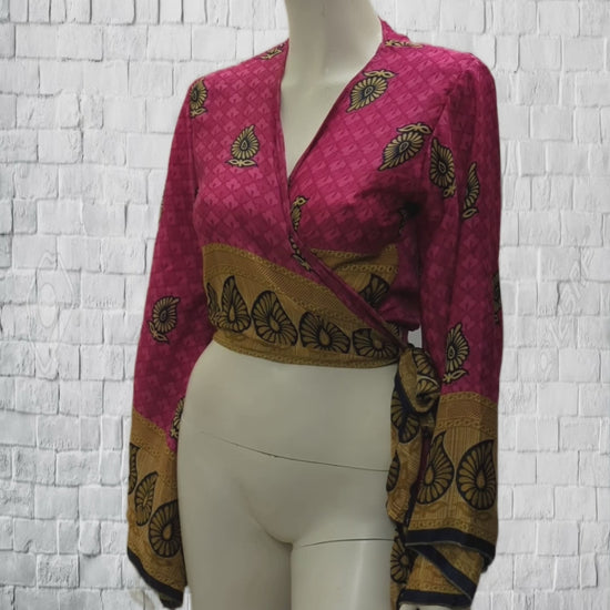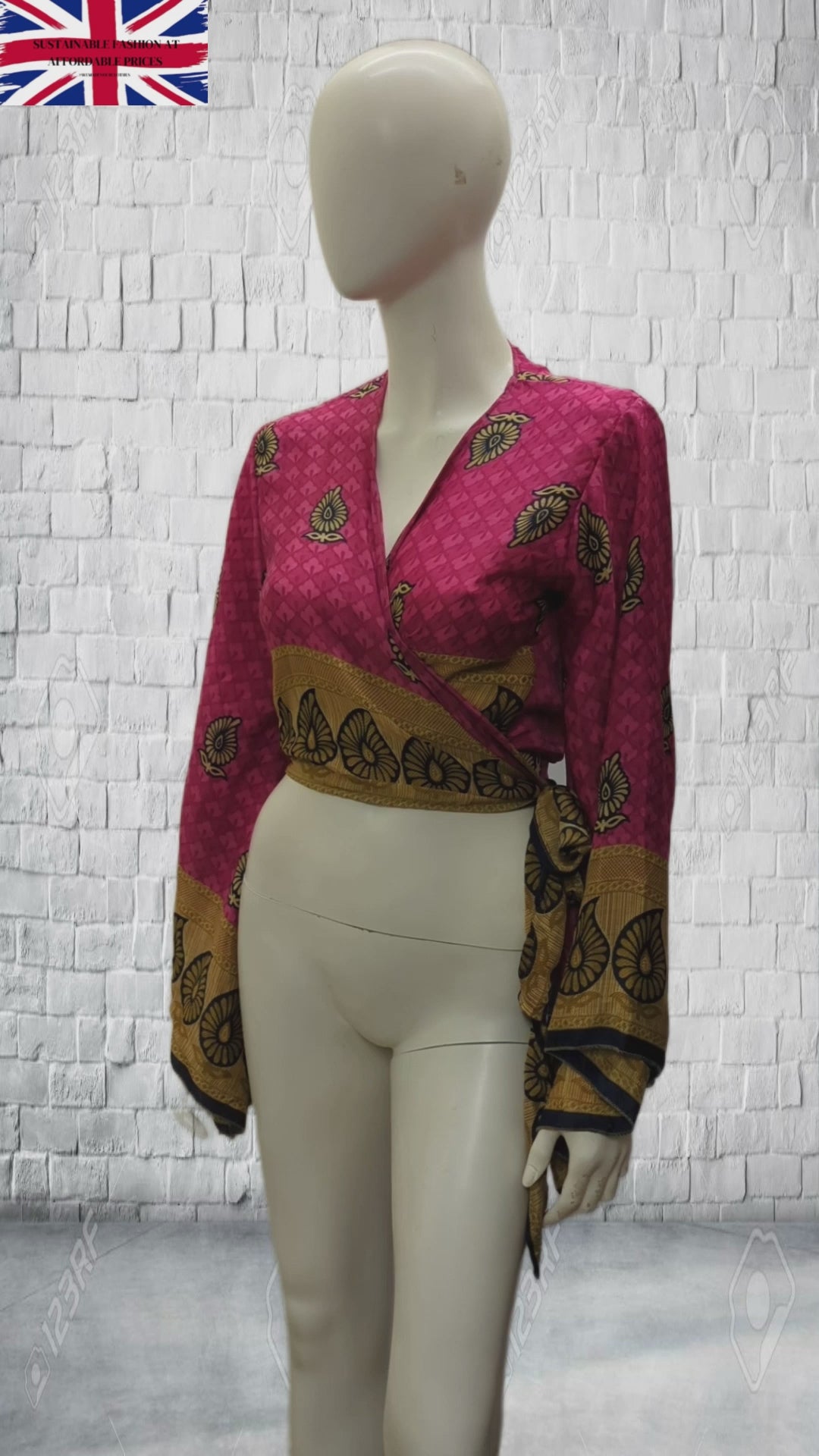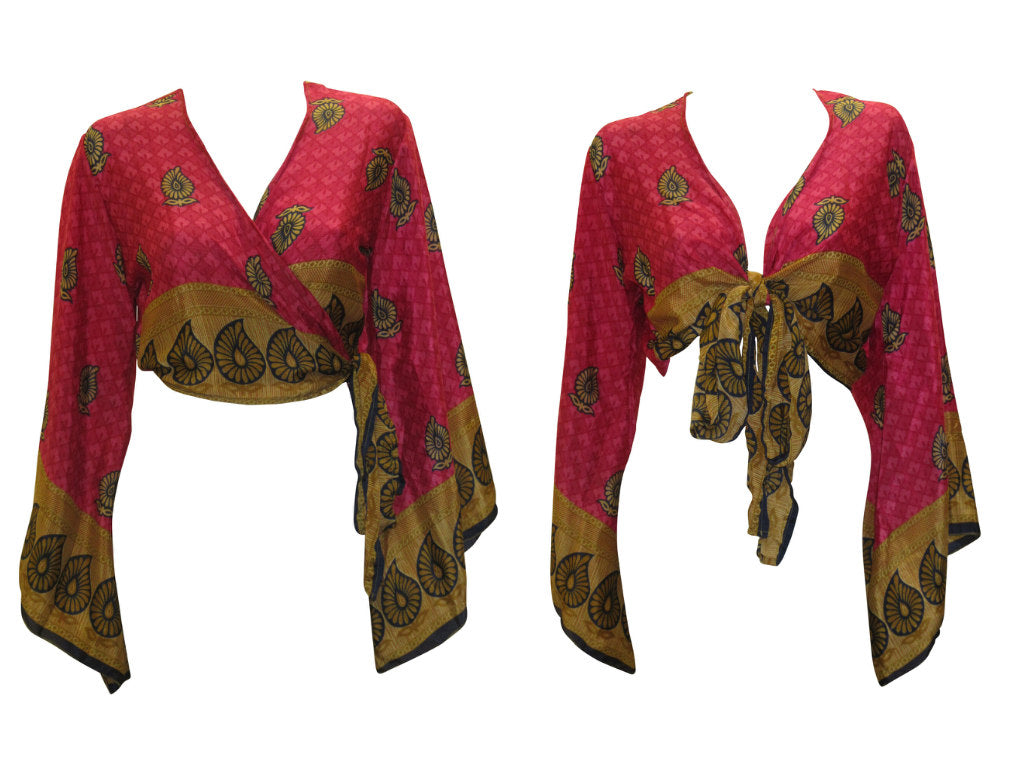RECYCLED BOHO RETRO BELL SLEEVES FRONT KNOT CROP TOP WRAP BLOUSE FREE SIZE UP TO 16 P55