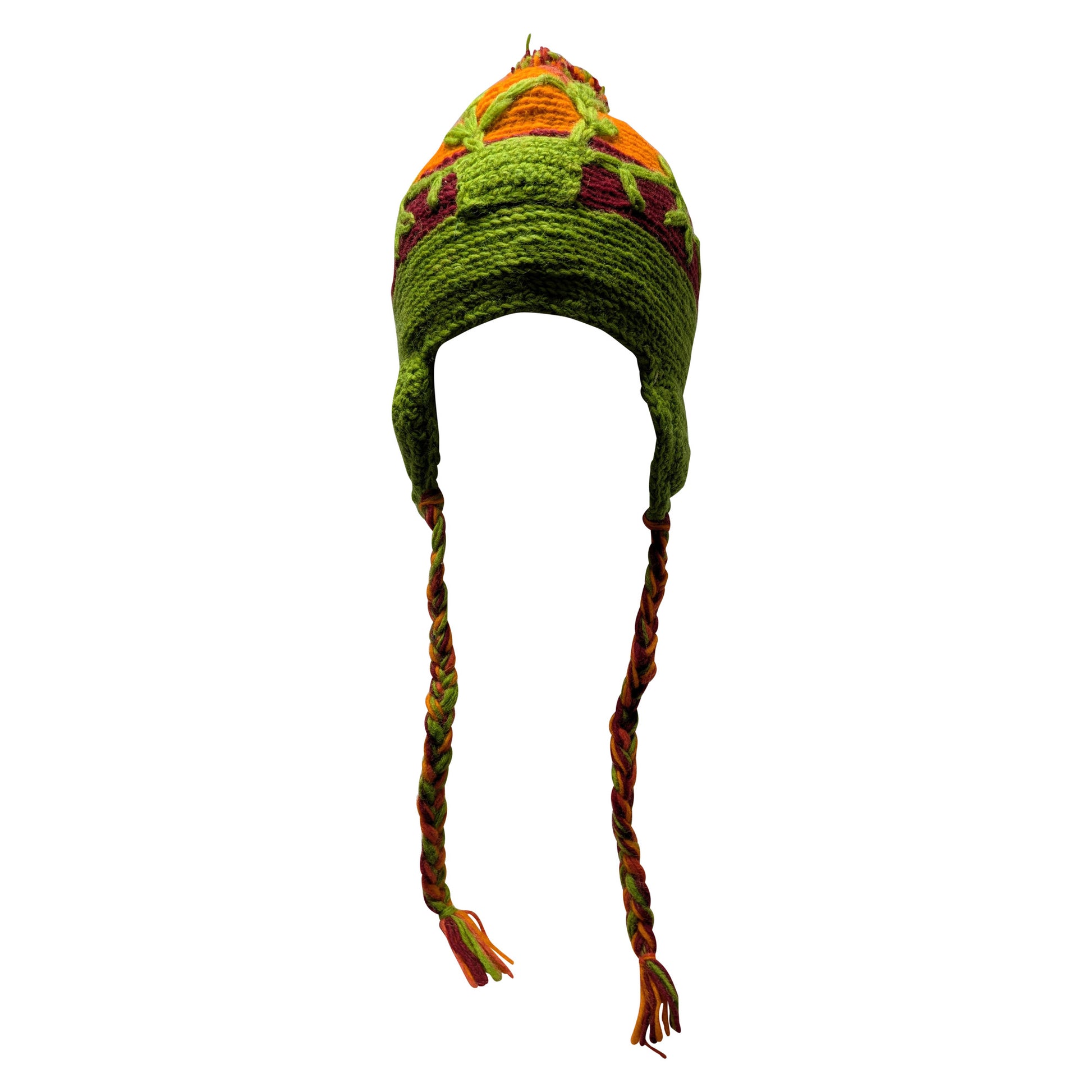 Recycled Hand Knit Embroidered Colour Block Fleece Lined Braided Tassels Bobble Winter Beanie Cap P2