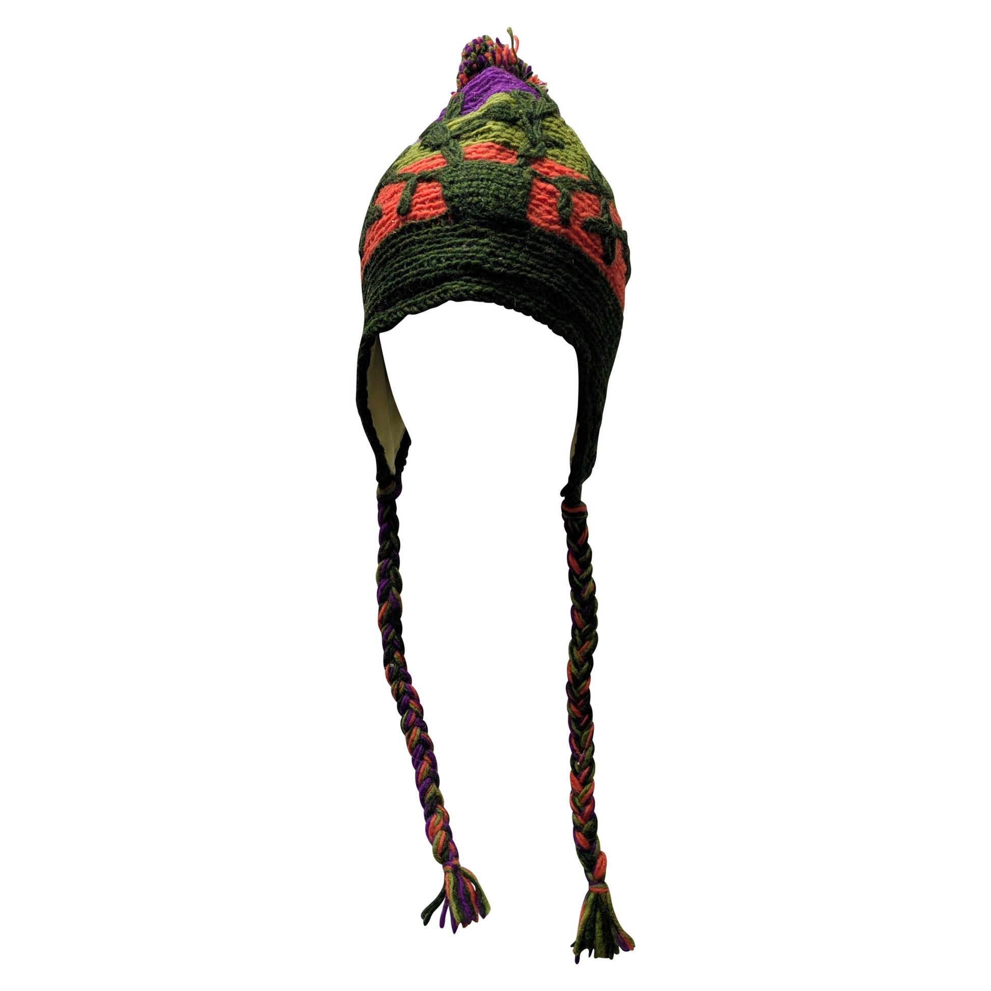 Recycled Hand Knit Embroidered Colour Block Fleece Lined Braided Tassels Bobble Winter Beanie Cap P5
