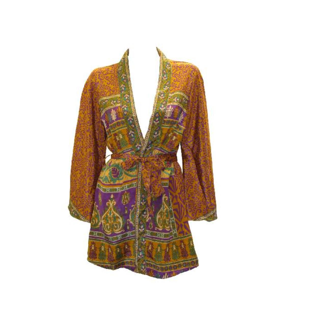 RECYCLED RETRO SARI KIMONO BEACH COVER-UP BOHO MINI ROBE FREE SIZE UP TO 12 P1