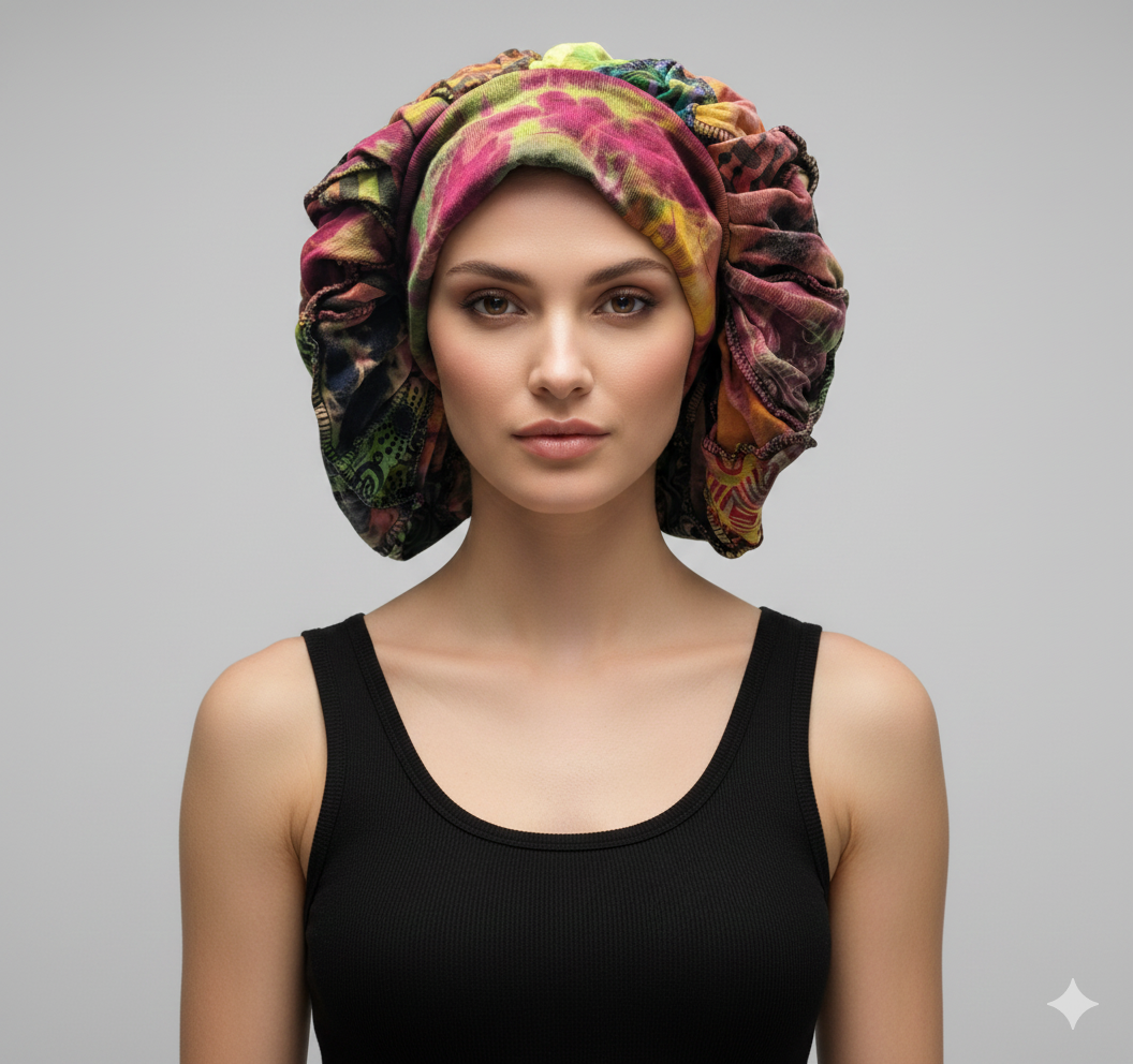 Recycled Reversible Bohemian Patchwork Block Print Wide Band Bonnet Winter Hat P1