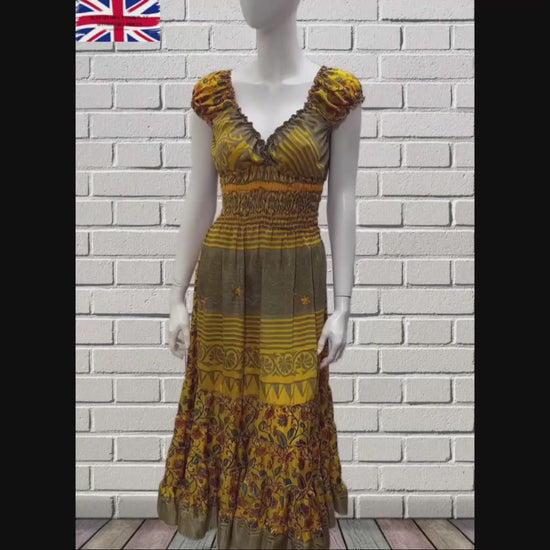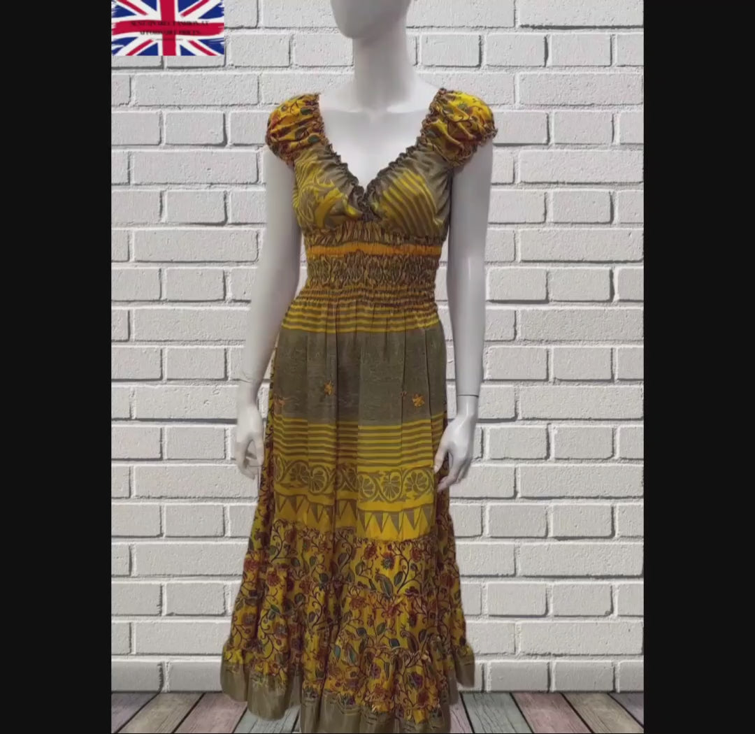 Recycled Sari Fabric V Neck Retro Ruffle Hem Maxi - Midi Dress Free Size Up To 18 P11