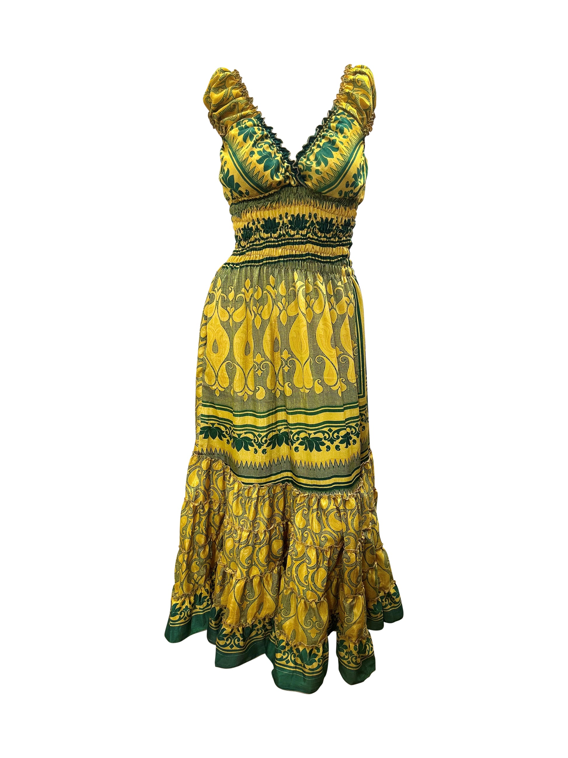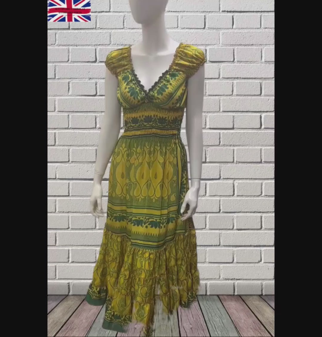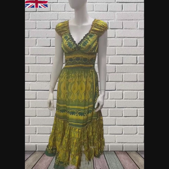 Recycled Sari Fabric V Neck Retro Ruffle Hem Maxi - Midi Dress Free Size Up To 18 P4