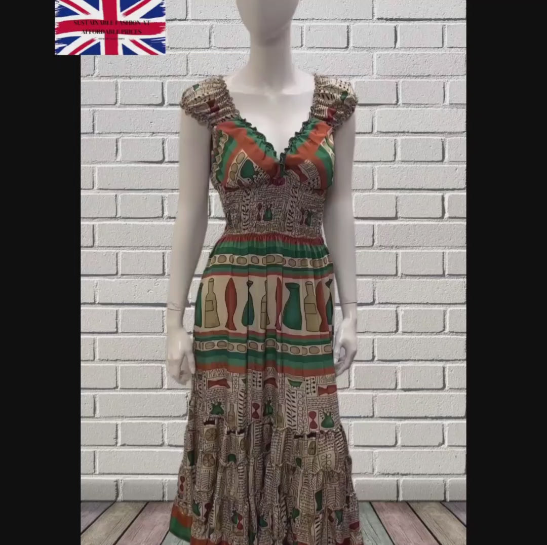 Recycled Sari Fabric V Neck Retro Ruffle Hem Maxi - Midi Dress Free Size Up To 18 P7