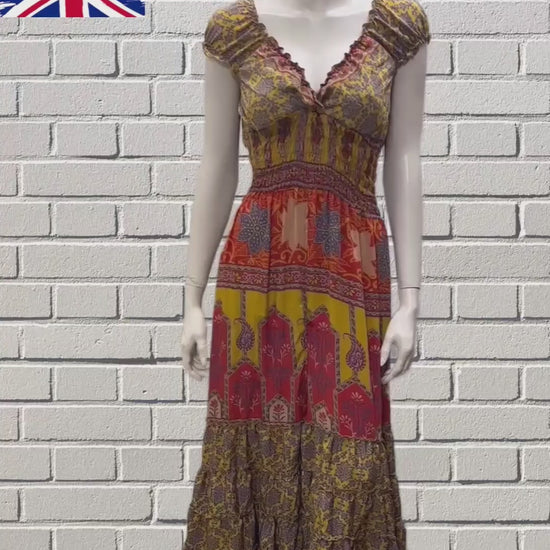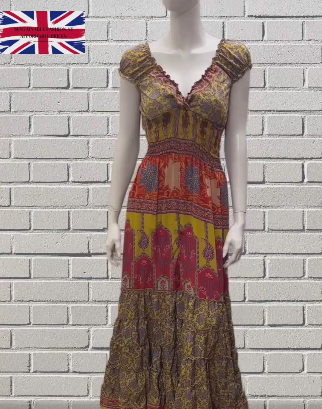 Recycled V Neck Retro Ruffle Hem Maxi Dress Free Size Up To 18 P96