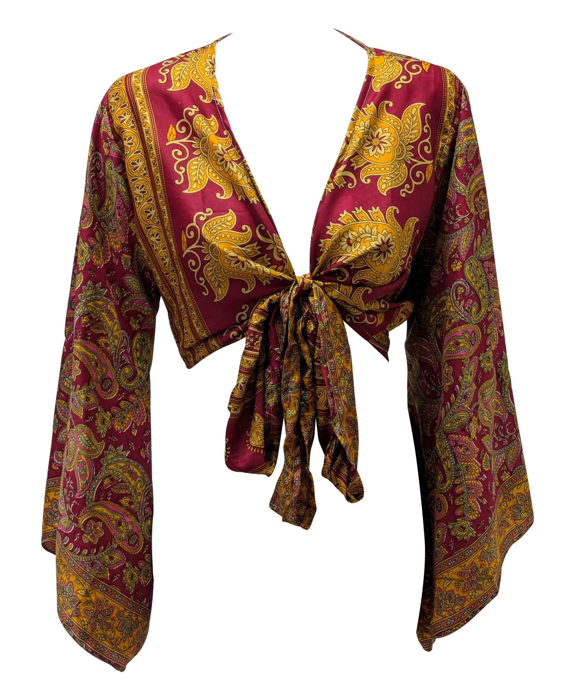RETRO BELL SLEEVES FRONT KNOT CROP TOP WRAP BLOUSE FREE SIZE UP TO 16 P148