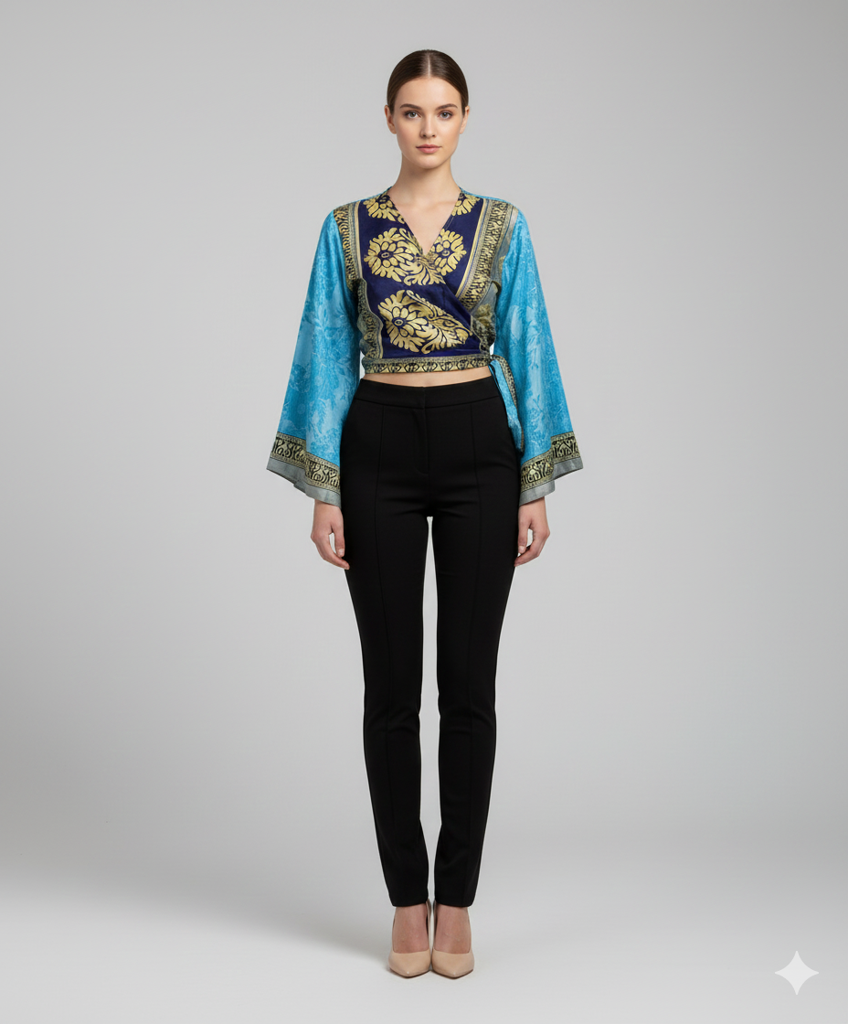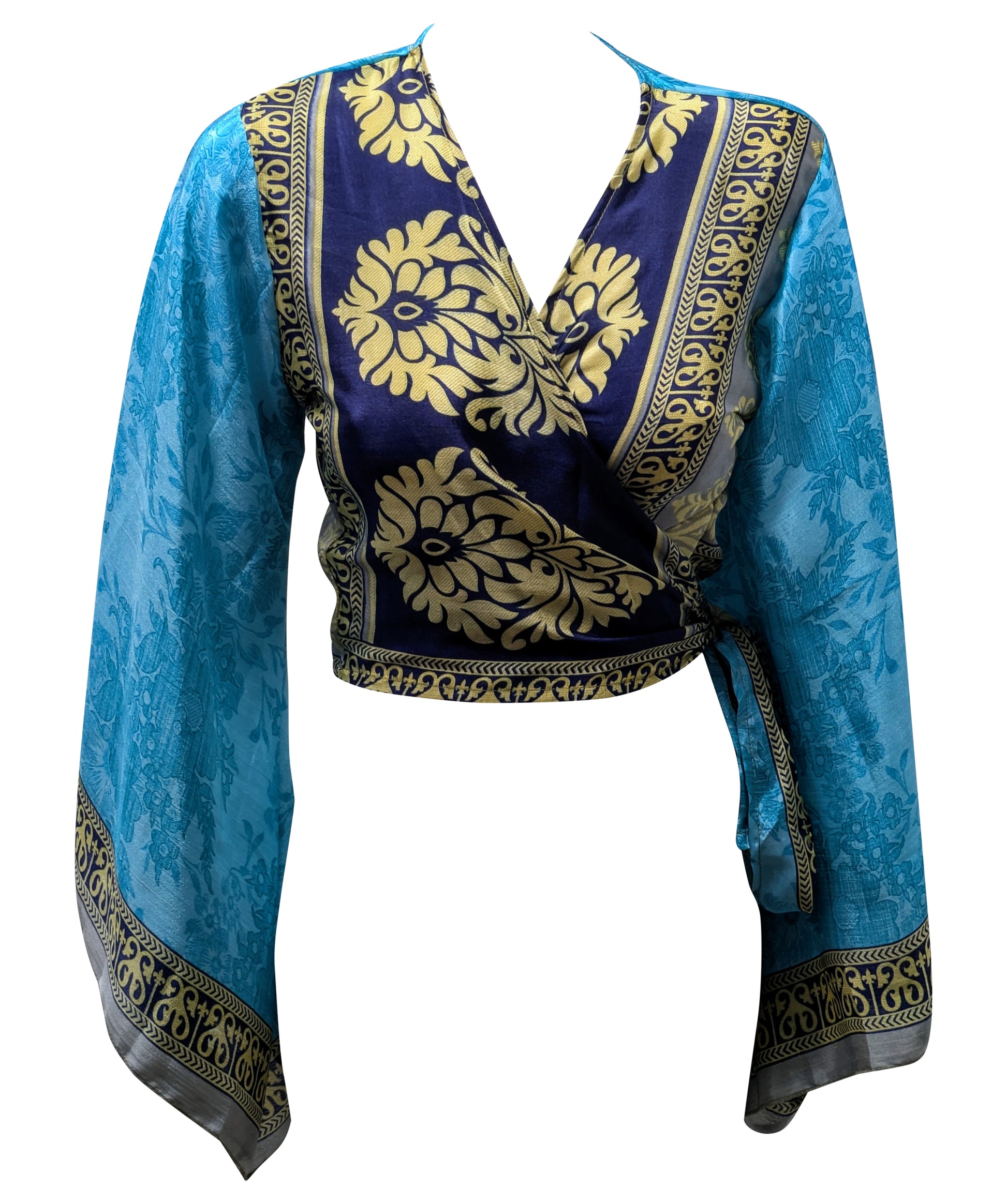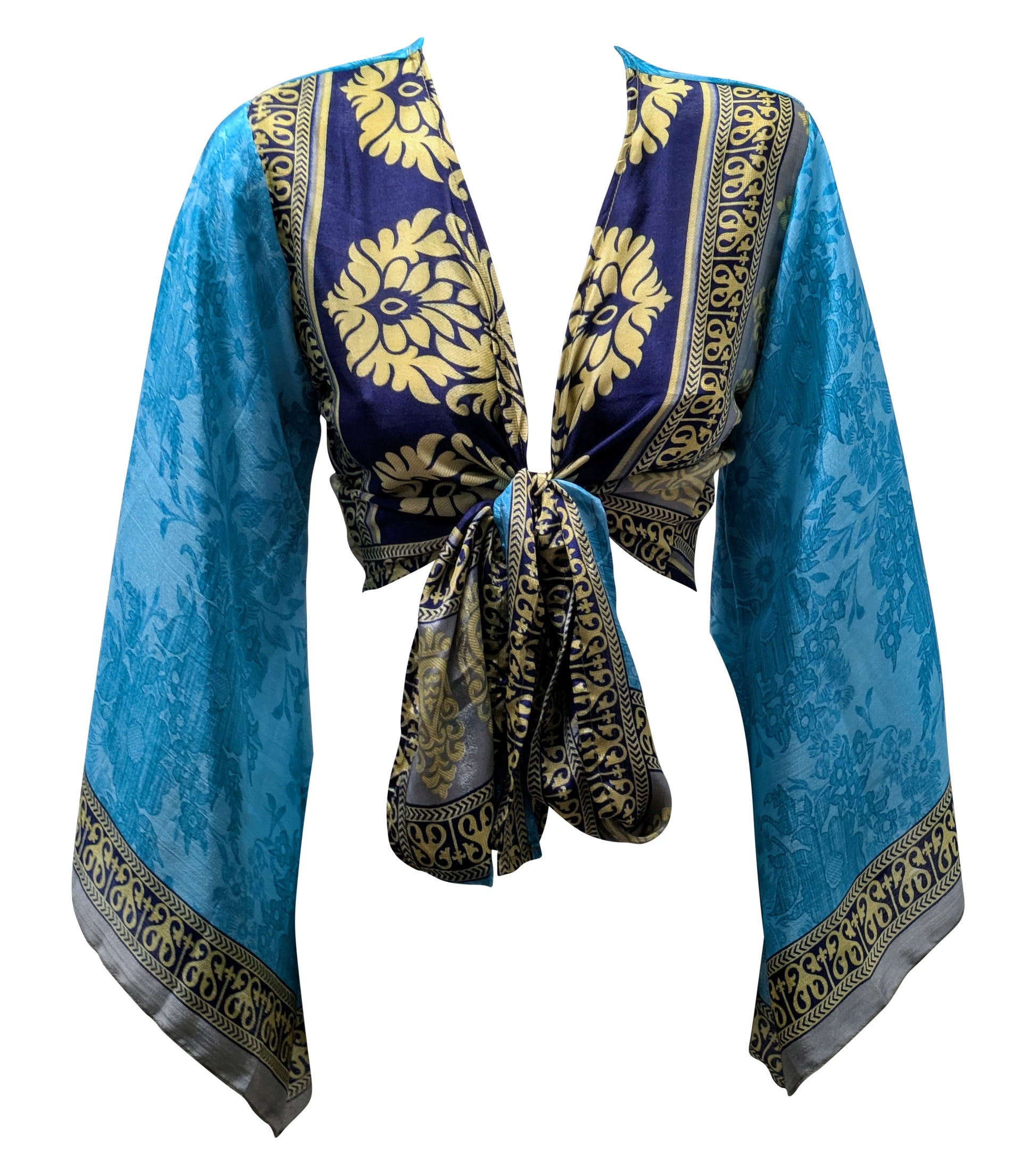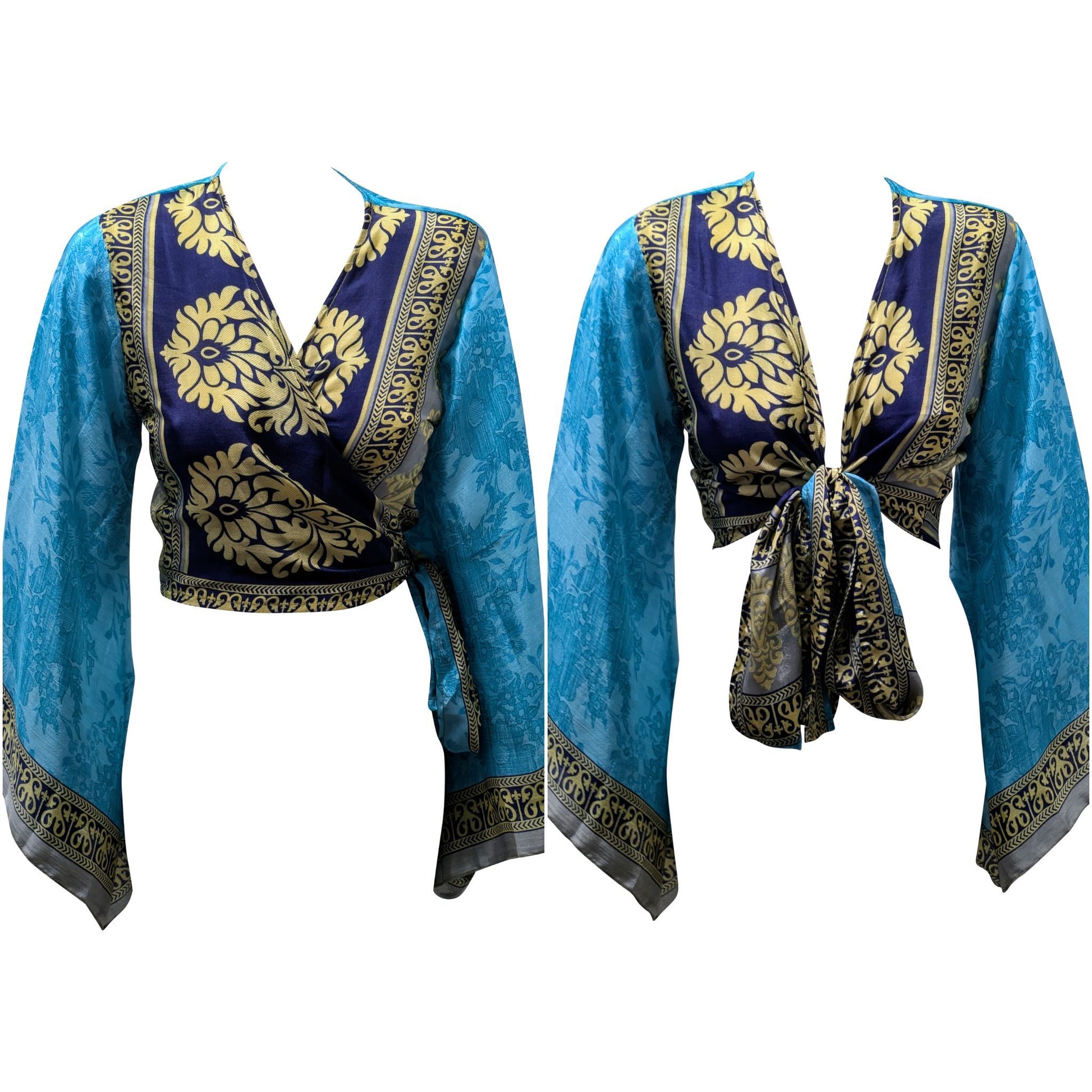 RETRO BELL SLEEVES FRONT KNOT CROP TOP WRAP BLOUSE FREE SIZE UP TO 16 P145