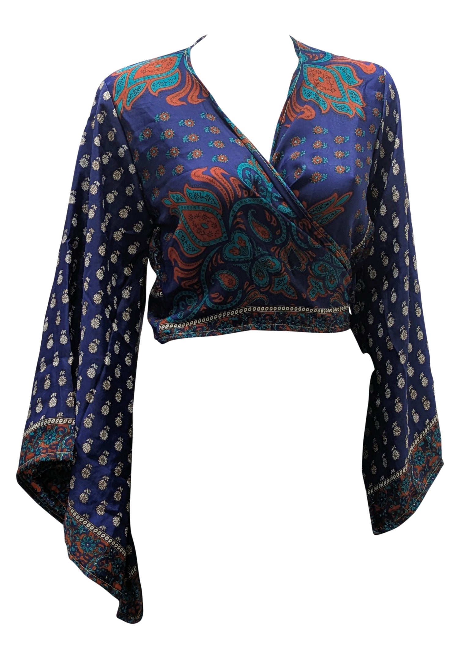 RETRO BELL SLEEVES FRONT KNOT CROP TOP WRAP BLOUSE FREE SIZE UP TO 16 P151