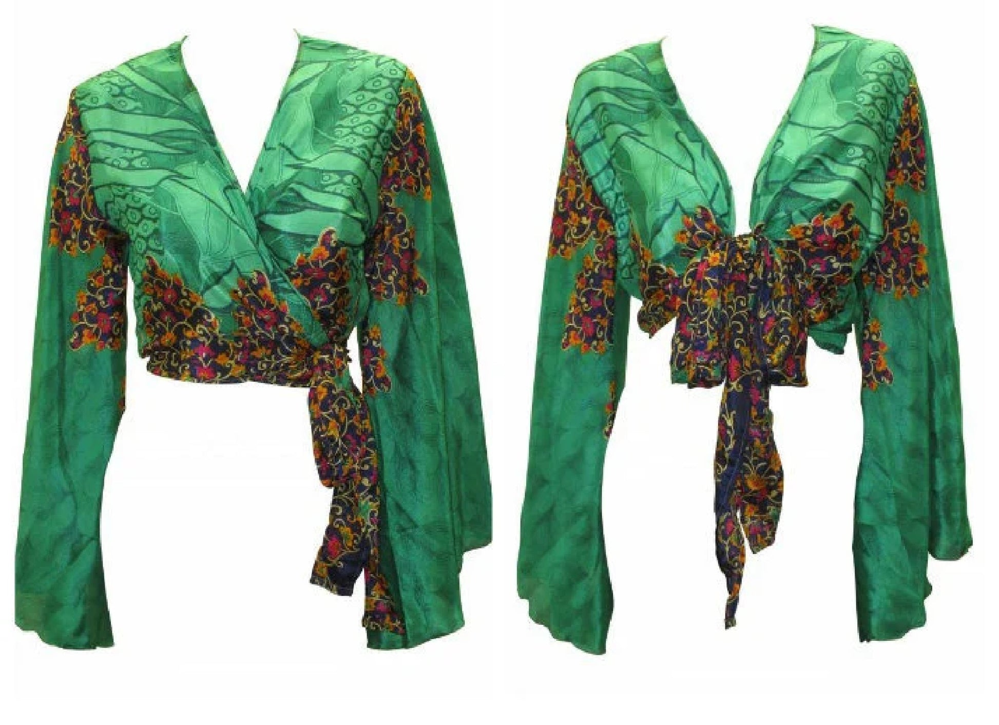 RETRO BELL SLEEVES FRONT KNOT CROP TOP WRAP BLOUSE FREE SIZE UP TO 16 P16
