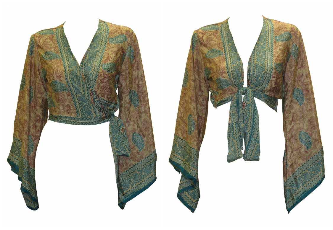 RETRO BELL SLEEVES FRONT KNOT CROP TOP WRAP BLOUSE FREE SIZE UP TO 16 P62