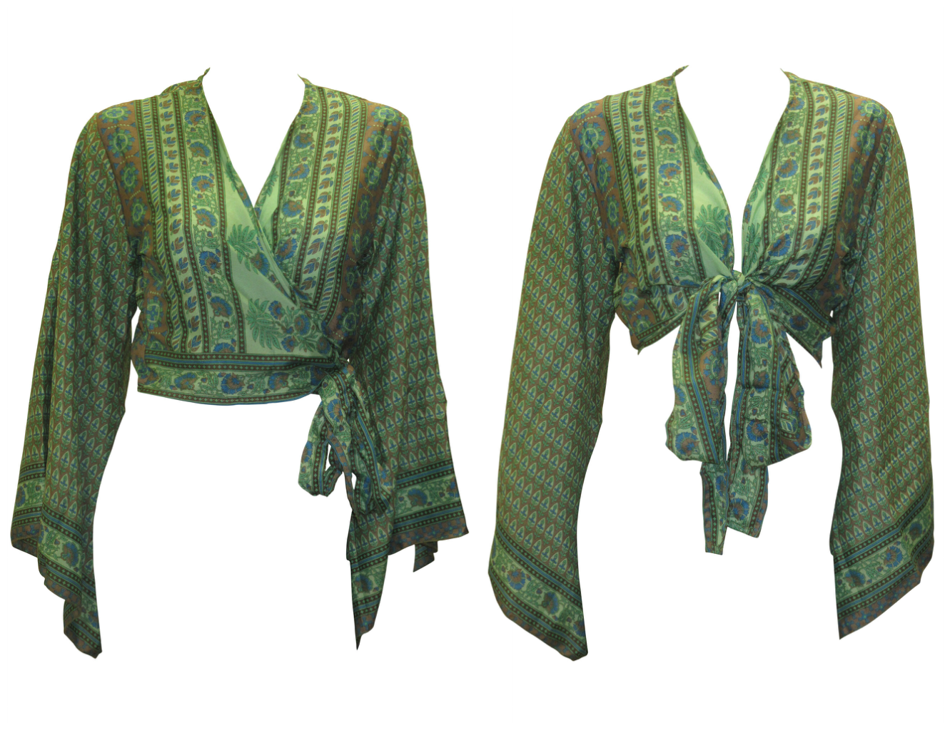 RETRO BELL SLEEVES FRONT KNOT CROP TOP WRAP BLOUSE FREE SIZE UP TO 16 P77