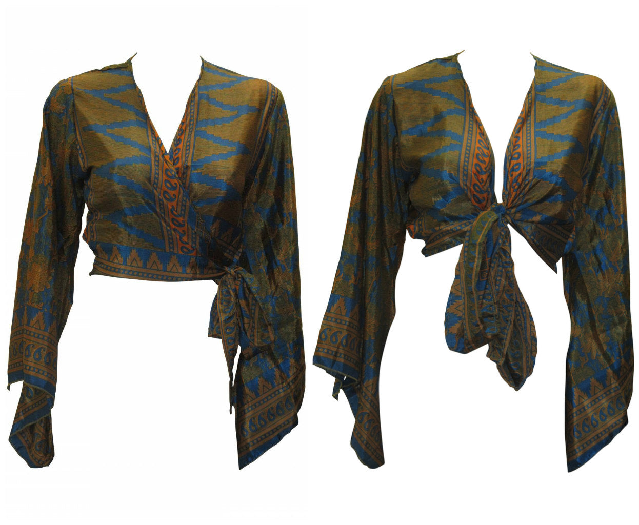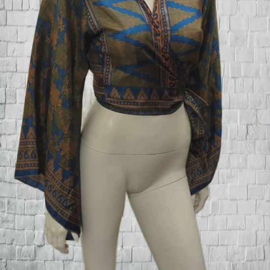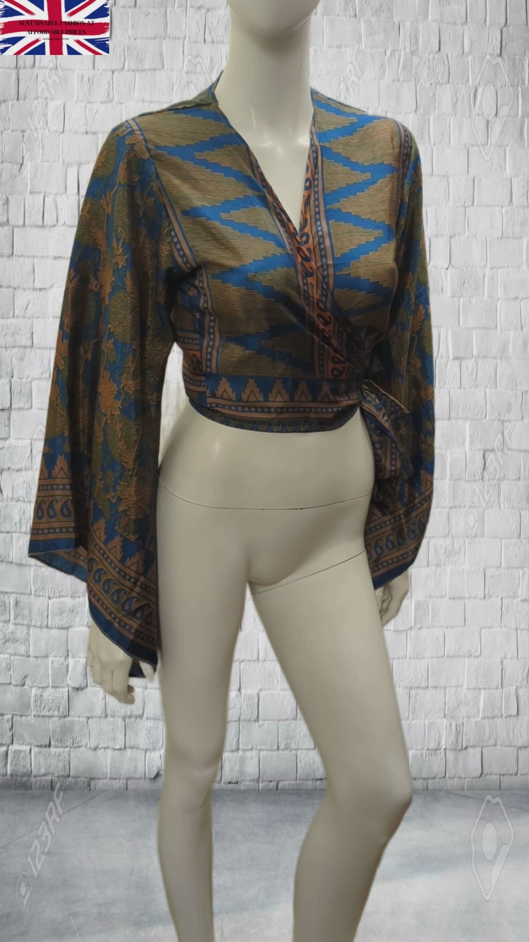 RETRO BELL SLEEVES FRONT KNOT CROP TOP WRAP BLOUSE FREE SIZE UP TO 16 P78