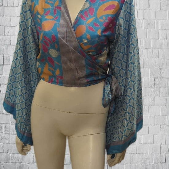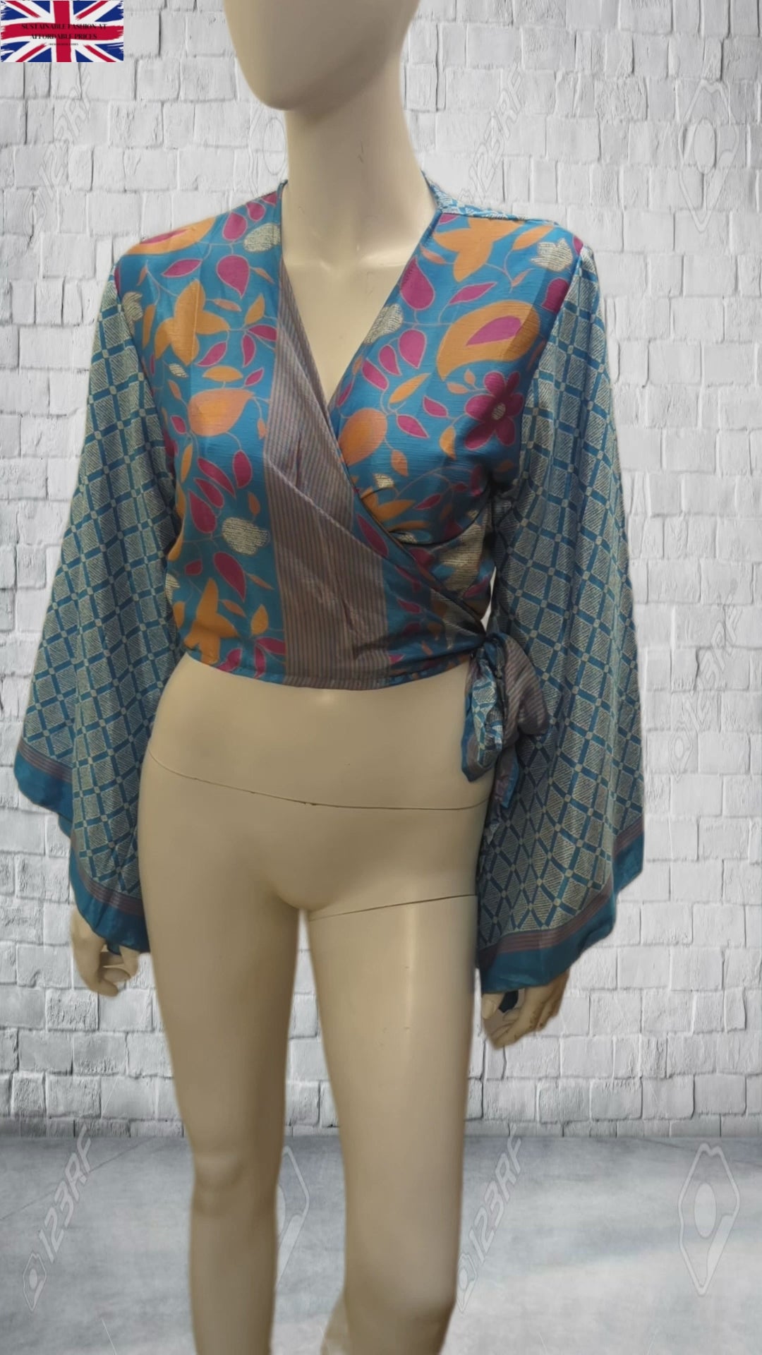 RETRO BELL SLEEVES FRONT KNOT CROP TOP WRAP BLOUSE FREE SIZE UP TO 16 P79