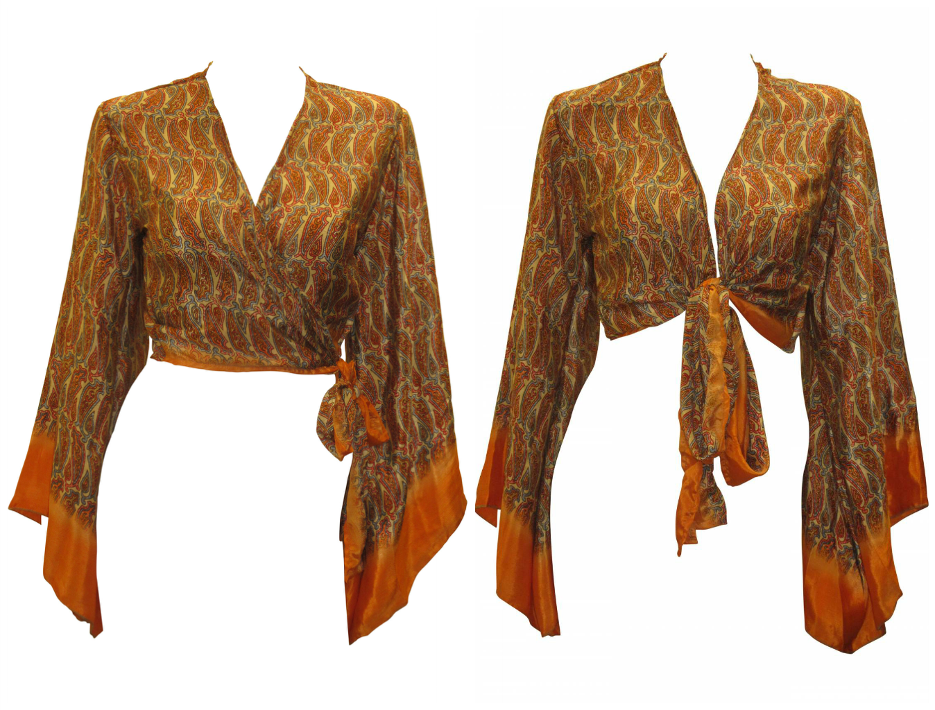 RETRO BELL SLEEVES FRONT KNOT CROP TOP WRAP BLOUSE FREE SIZE UP TO 16 P80
