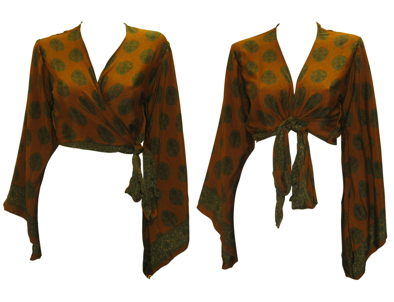 RETRO BELL SLEEVES FRONT KNOT CROP TOP WRAP BLOUSE FREE SIZE UP TO 16 P89
