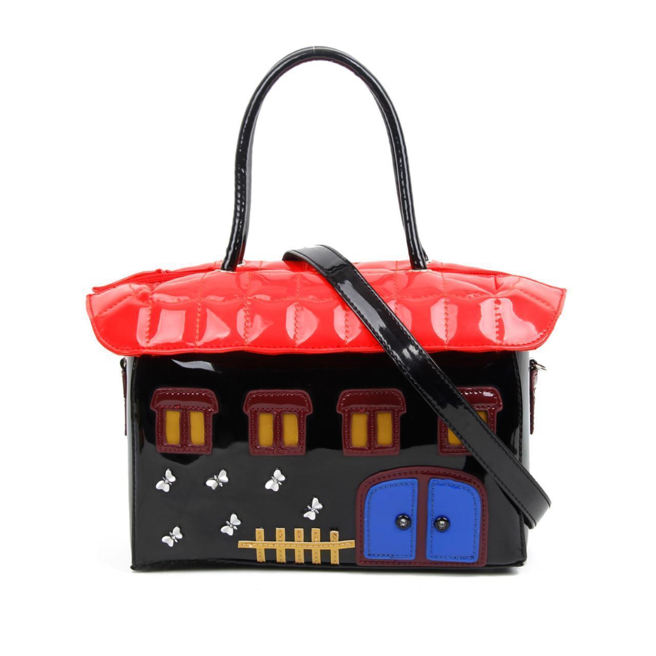 STATEMENT FAUX LEATHER BAG RETRO HOUSE HANDBAG RED ROOF SHOULDER BAG BLACK