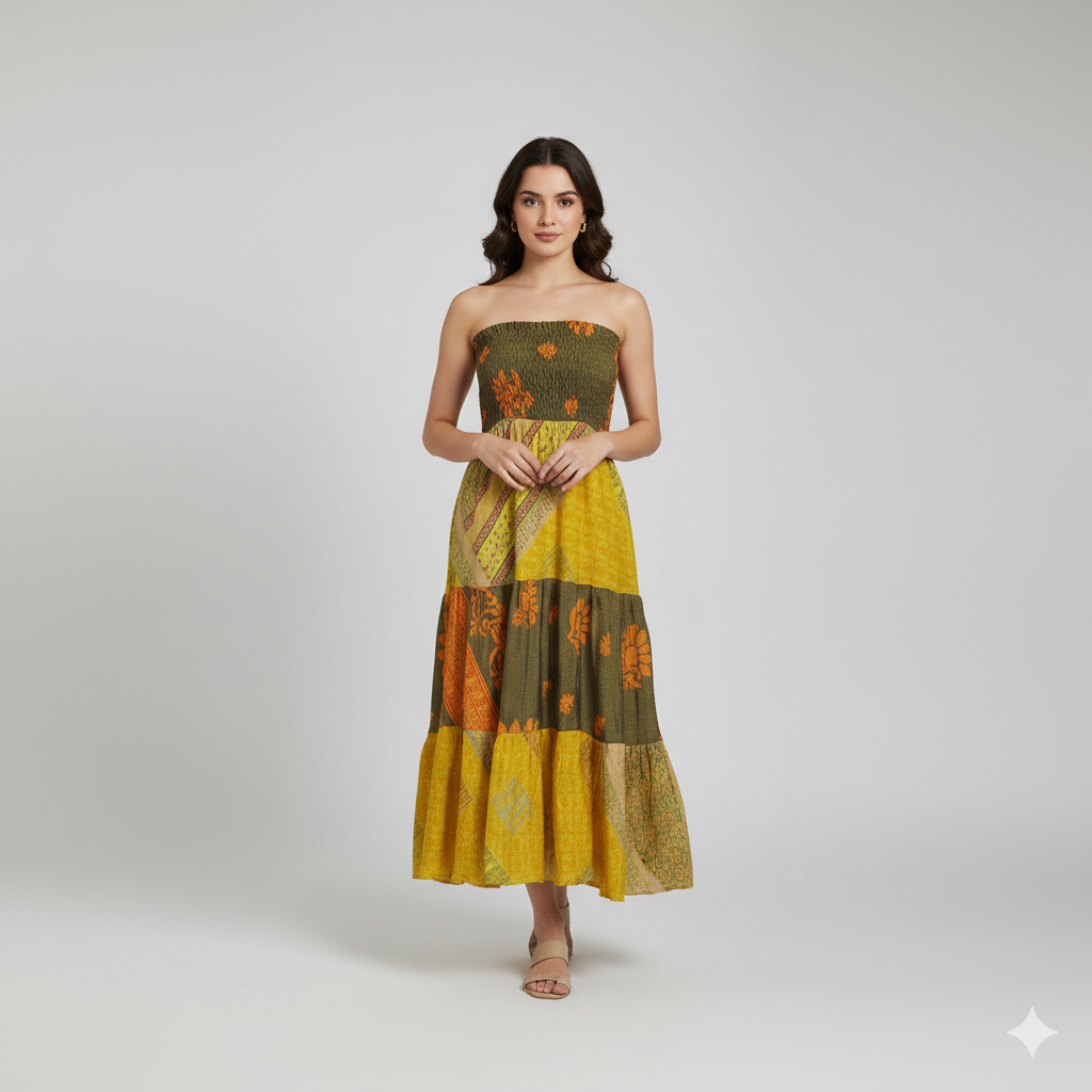 Upcycled 2in1 Skirt and Dress Retro Shirred Festival Boho Tiered Flowy Maxi Free Size Up To 20 P120