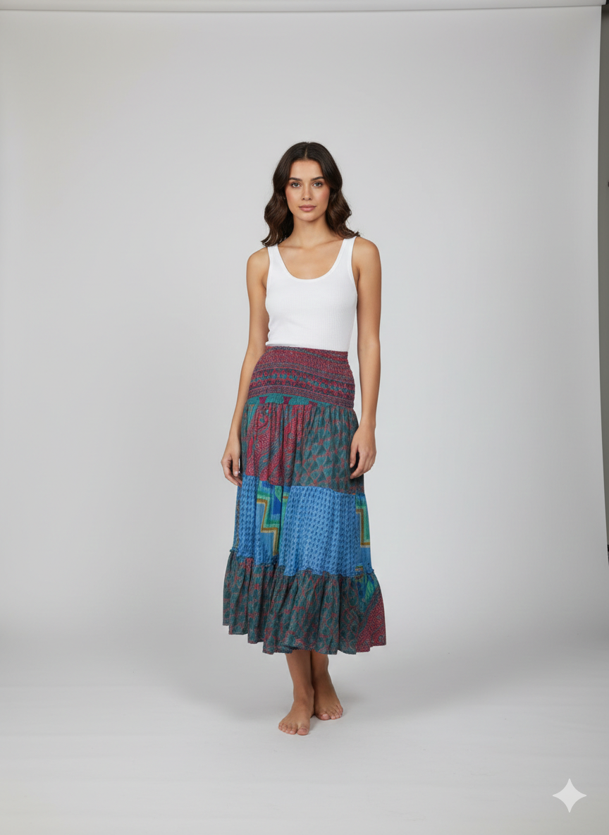 Upcycled 2in1 Skirt and Dress Retro Shirred Festival Boho Tiered Flowy Maxi Free Size Up To 20 P112