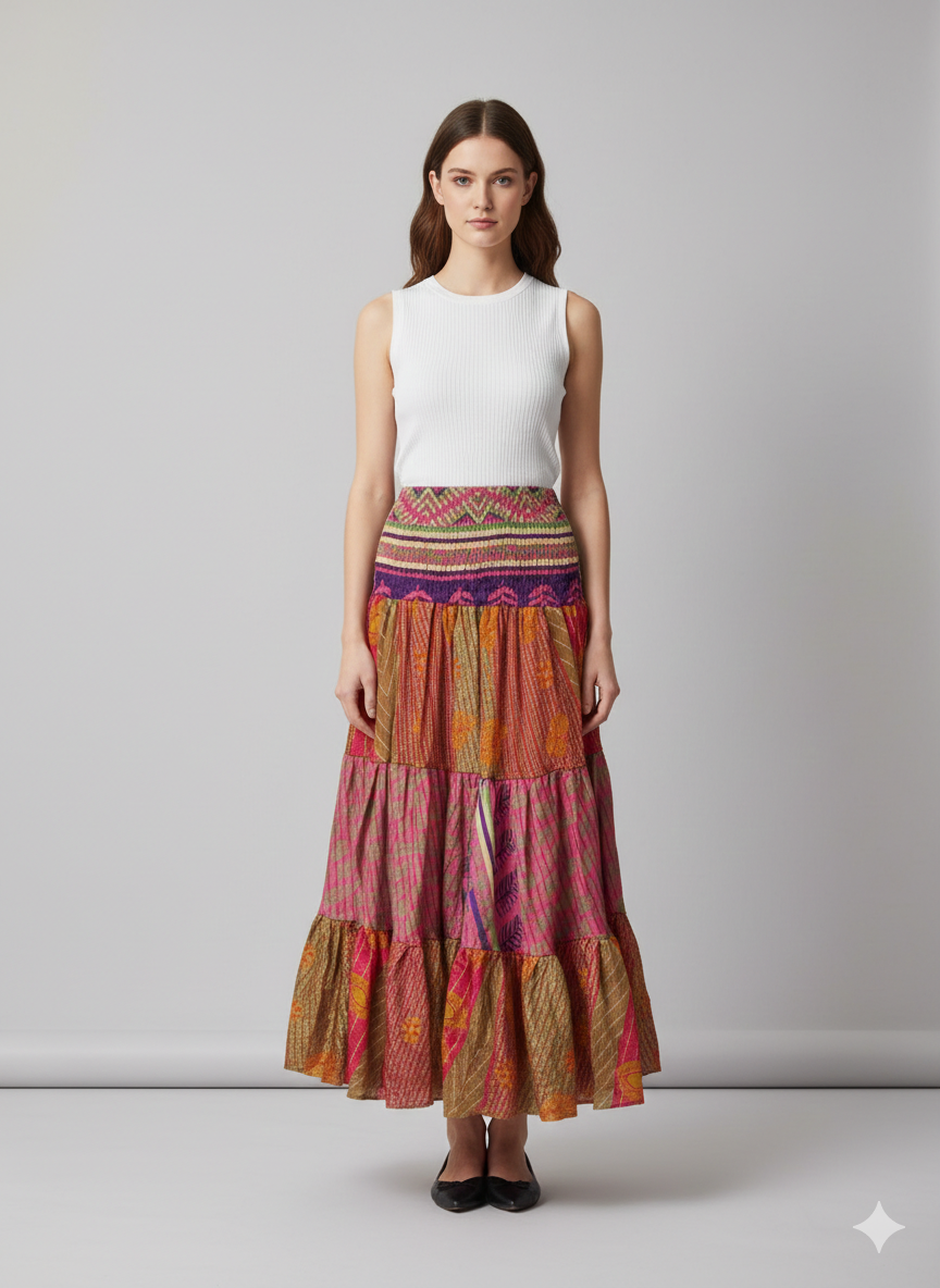 Upcycled 2in1 Skirt and Dress Retro Shirred Festival Boho Tiered Flowy Maxi Free Size Up To 20 P133