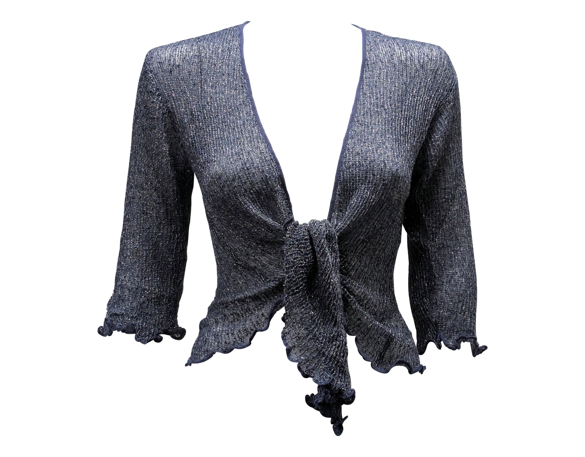 Women's Boho Lurex Knit Shrug Chic Crochet style Cardigan onesize Up To 20 DENIM & SILVER