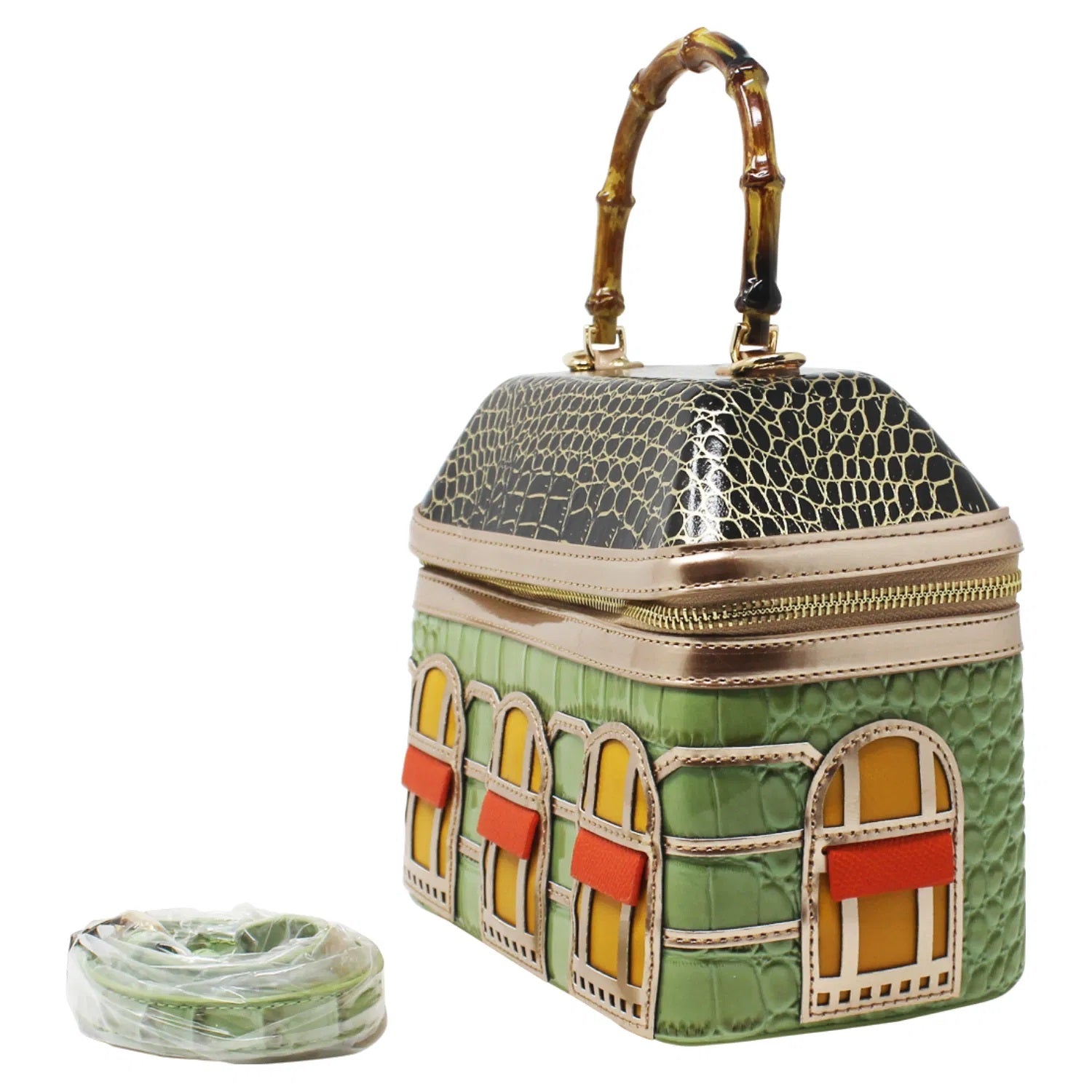 WOMEN'S STATEMENT BAMBOO TOP HANDLE HOUSE DESIGN BAG WITH DETACHABLE STRAP